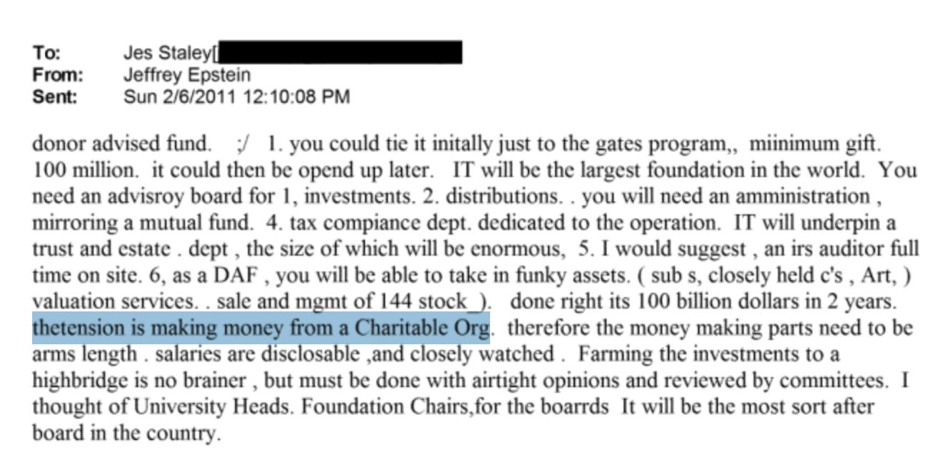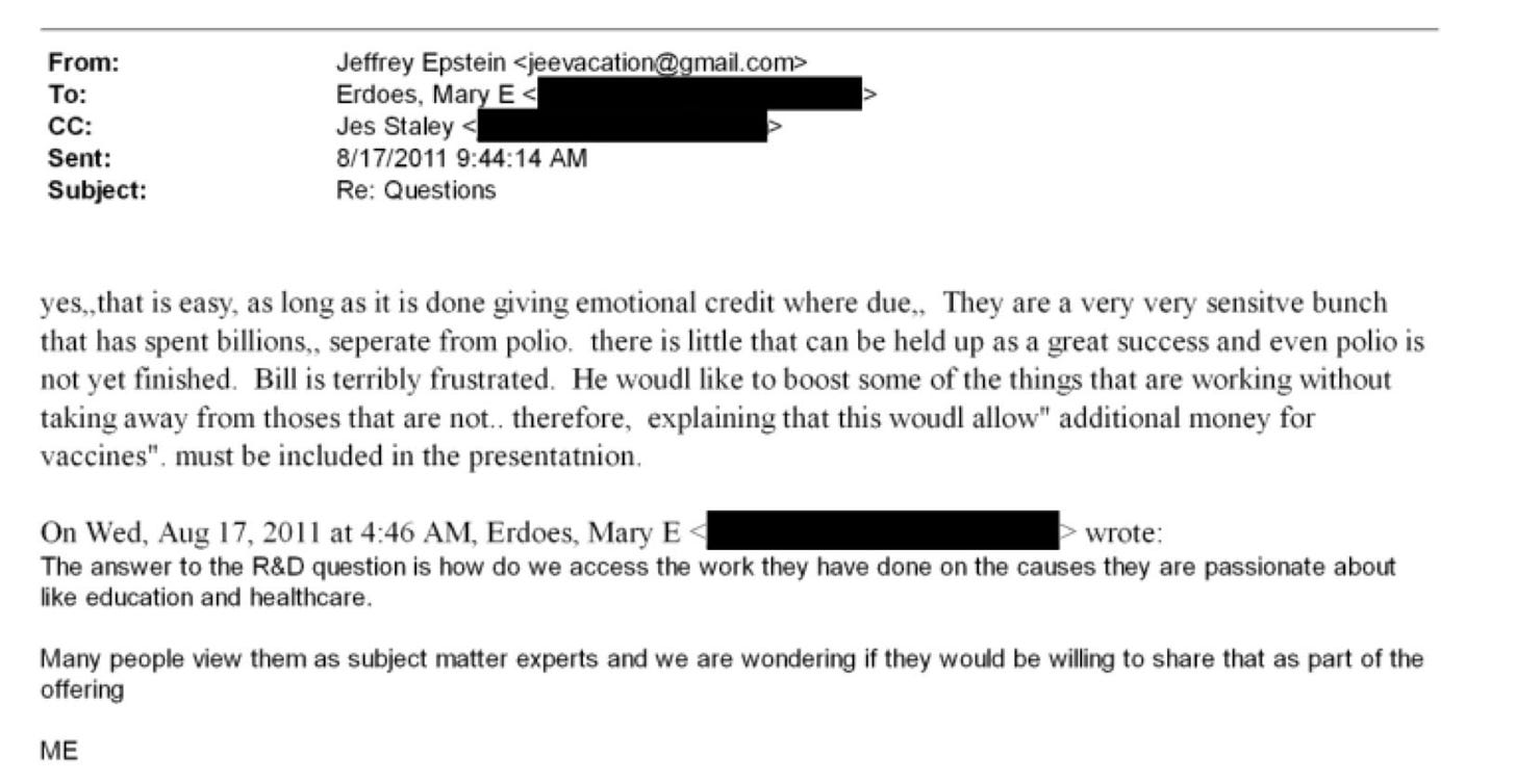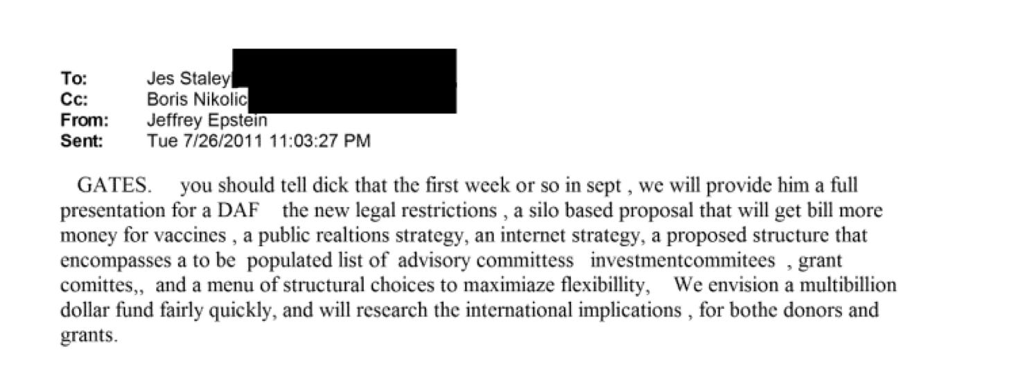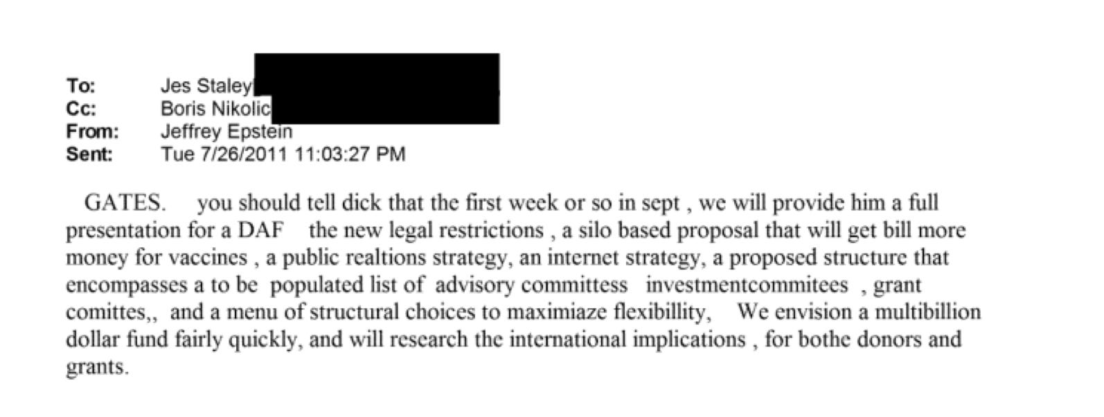 “Drifts” is a kind word for what went down. There’s so much more. Emails from JPMorgan more or less asking Epstein exactly how this whole operation of funds-collecting-for-Bill Gates’-pet-projects was supposed to go down. (Ji: “JPMorgan wasn’t offering Epstein a seat at the table. They were asking him to design the table.”) As well as messages from Epstein to the finance friendlies about Gates and Foundation sensitivities, about which Epstein seemed somewhat too informed. (Hint: The answer in these emails always seems to be “Vaccines!”)