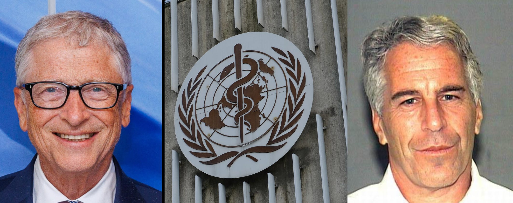 Photo credits: Bill Gates, © European Union, 2026, cropped, CC 4.0. WHO: Photo by Guilhem Vellut from Annecy, France CC 2.0. Jeffrey Epstein, mug shot, Palm Beach County Sheriff’s Department. No endorsement implied.