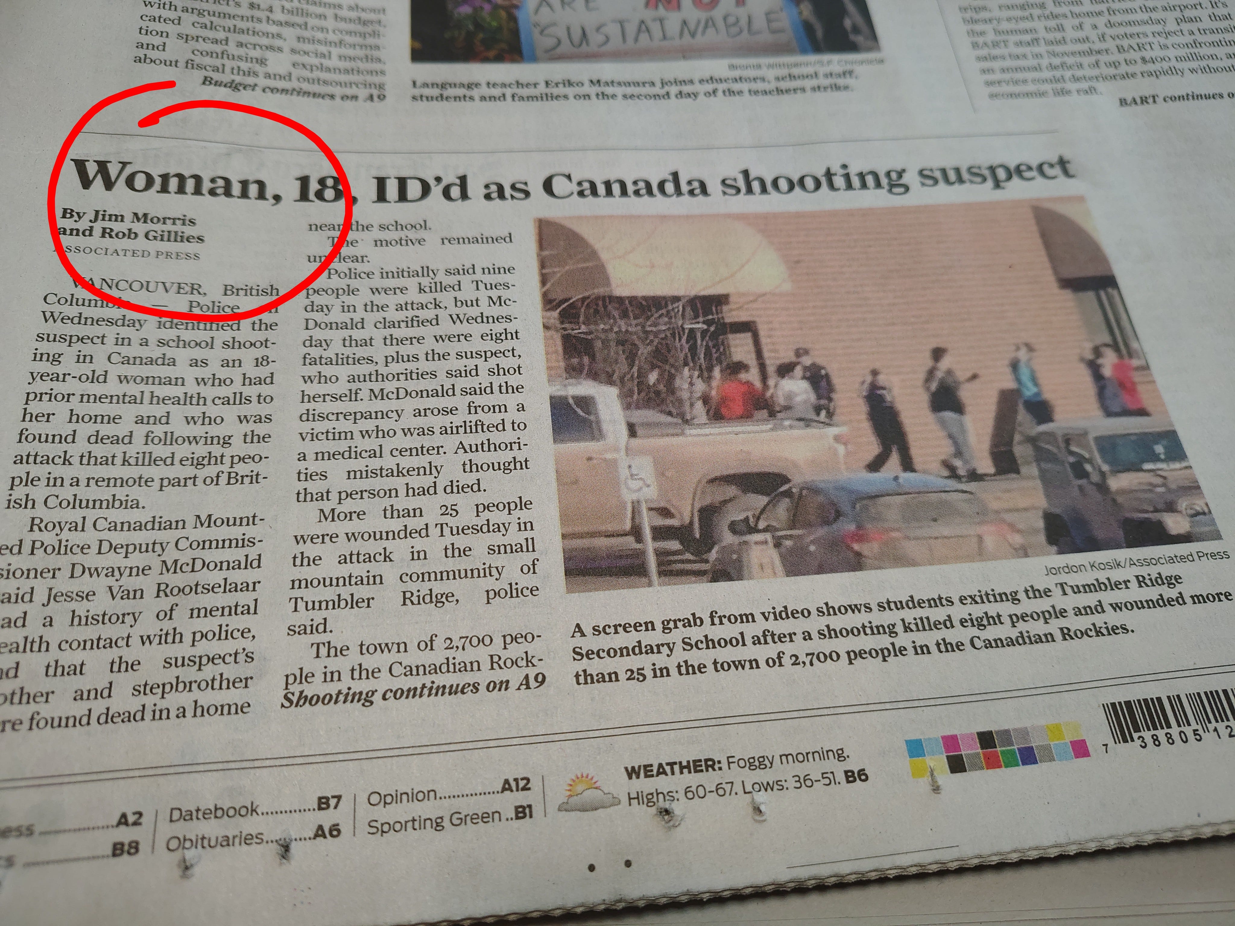 I’ve long been a reader of print news, but lately, I just can’t square the words on the page with that thing I used to call “reality.” For instance, there’s the case of the tragic mass school shooting in Tumbler Ridge, British Columbia, with 25 injured and 9 dead, and an alleged shooter described in the press conference itself as a “biological male.” Yet the editor of the story decides to prioritize the word “Woman” in this headline?